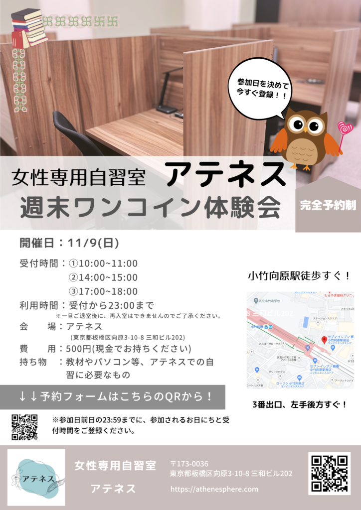 肌寒くなってきましたね!休みの日に温かくゆったり過ごす時間もいいけど、ちょっと集中して勉強や執筆等、、、やることある!!という方、自習室を利用してみるのはいかがでしょうか。ワンコイン体験会でお試しいただくチャンスです。ご参加お待ちしております!